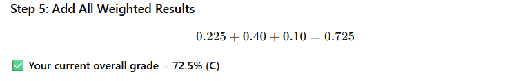 - Add the test’s weight (e.g., 20%, 30%, etc.).