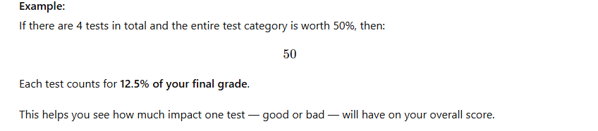 If multiple tests make up a single category (like “Tests = 50%”), you can find how much each individual test is worth.